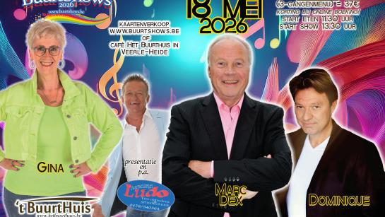 Buurtshow Festiviteit UiTPAS Vlieg Prijs Basistarief: 17 EURinkom + eten: 37 EURKansentarief met UiTPAS Kempen: 3.4 EUR Koop tickets Praktische info Telefoonnummer voor Reservaties 0473447563 Praktische info E-mailadres voor reservaties info.hetbuurthuis@gmail.com Praktische info URL voor reservaties Koop tickets Kaart 51.0523294, 4.9788991 Praktische info Datum Maandag 18/05/2026 - 11:30 - 18:00 Toevoegen aan kalender Praktische info Organisator Buurtshows Praktische info Adres Het Buurthuis Zandstraat 13 2431 Veerle (Laakdal) België