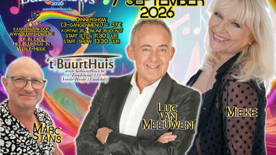 Buurtshow Festiviteit UiTPAS Vlieg Prijs Basistarief: 17 EURinkom + eten: 37 EURKansentarief met UiTPAS Kempen: 3.4 EUR Koop tickets Praktische info Telefoonnummer voor Reservaties 0473447563 Praktische info E-mailadres voor reservaties info.hetbuurthuis@gmail.com Praktische info URL voor reservaties Koop tickets Kaart 51.0523294, 4.9788991 Praktische info Datum Maandag 07/09/2026 - 11:30 - 18:00 Toevoegen aan kalender Praktische info Organisator Buurtshows Praktische info Adres Het Buurthuis Zandstraat 13 2431 Veerle (Laakdal) België