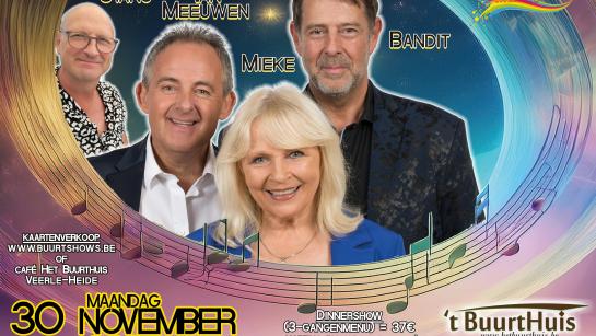 Buurtshow Festiviteit UiTPAS Vlieg Prijs Basistarief: 17 EURinkom + eten: 37 EURKansentarief met UiTPAS Kempen: 3.4 EUR Koop tickets Praktische info Telefoonnummer voor Reservaties 0473447563 Praktische info E-mailadres voor reservaties info.hetbuurthuis@gmail.com Praktische info URL voor reservaties Koop tickets Kaart 51.0523294, 4.9788991 Praktische info Datum Maandag 30/11/2026 - 00:00 - 23:59 Toevoegen aan kalender Praktische info Organisator Buurtshows Praktische info Adres Het Buurthuis Zandstraat 13 2431 Veerle (Laakdal) België