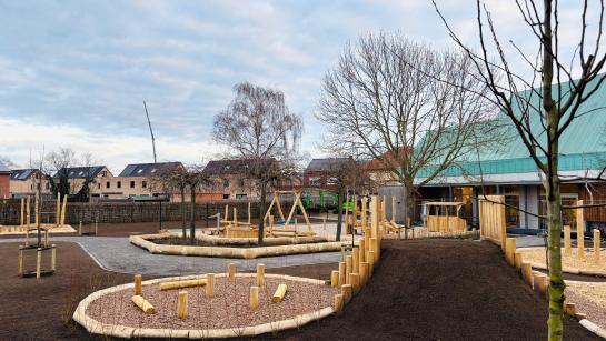 De kleuterspeelplaats onderging een grondige transformatie: van een verharde, grijze speelplaats naar een warme en groene speelomgeving. De nieuwe inrichting stimuleert spel, ontdekking en beweging in een natuurlijke context.