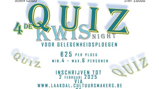Quiz Spel of quiz UiTPAS Vlieg Quiz voor gelegenheidsploegen Prijs Basistarief: 25 EURKansentarief met UiTPAS Kempen: 5 EUR Schrijf je in Praktische info Telefoonnummer voor Reservaties 0473447563 Praktische info E-mailadres voor reservaties laakdal@cultuursmakers.be Praktische info URL voor reservaties Koop tickets Kaart 51.0523294, 4.9788991 Praktische info Datum Zaterdag 07/02/2026 - 20:00 - 23:59 Toevoegen aan kalender Praktische info Organisator Cultuursmakers Laakdal Praktische info Adres Het Buurthuis Zandstraat 13 2431 Veerle (Laakdal) België Praktische info E-mailadres laakdal@cultuursmakers.be