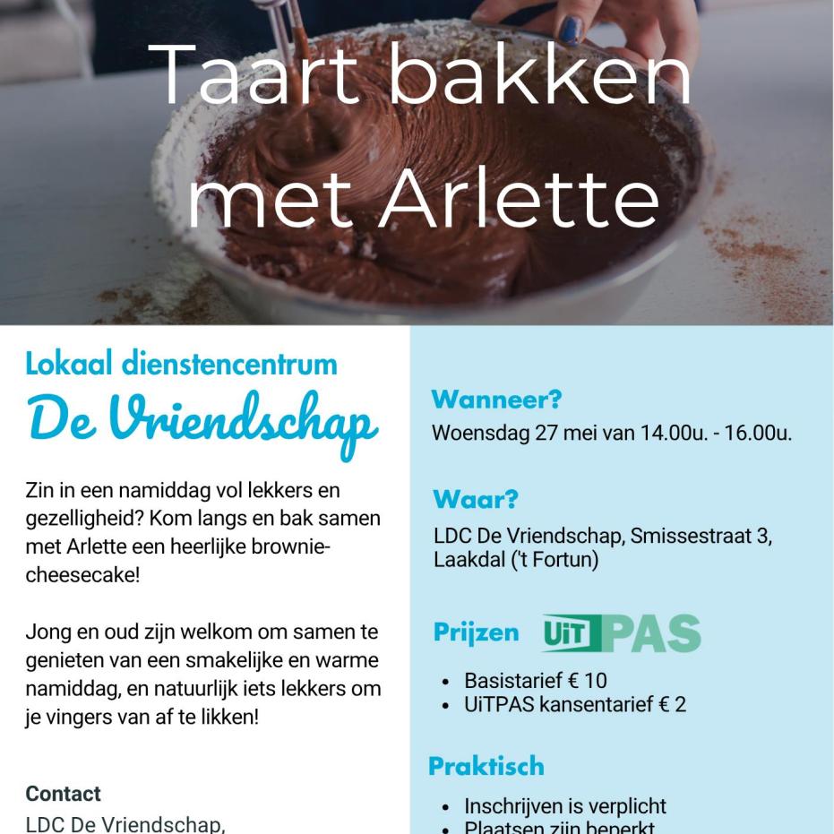 Zin in een namiddag vol lekkers en gezelligheid? Kom langs en bak samen met Arlette een heerlijke brownie-cheesecake! Jong en oud zijn welkom om samen te genieten van een smakelijke en warme namiddag, en natuurlijk iets lekkers om je vingers van af te likken!