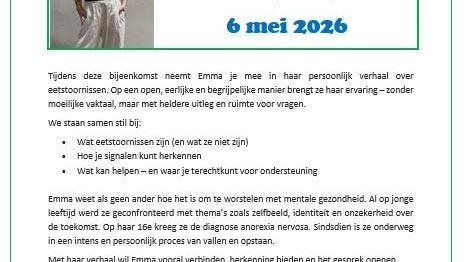 Tijdens deze bijeenkomst komt Emma, ervaringsdeskundige, langs die op een open, eerlijke en begrijpelijke manier vertelt over eetstoornissen. Geen moeilijke termen, wel duidelijke uitleg en ruimte om vragen te stellen.