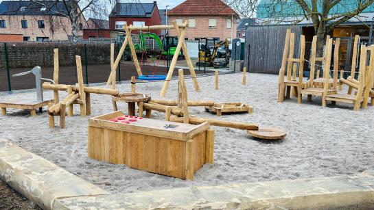 De speelplaats beschikt over houten speeltuigen, een evenwichtsparcours, rustige zithoekjes, een buitenklas... Buiten spelen en bewegen in een uitdagende omgeving draagt bij aan de ontwikkeling van kinderen en biedt hen ruimte om te groeien, te experimenteren en samen te spelen.